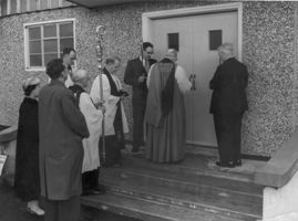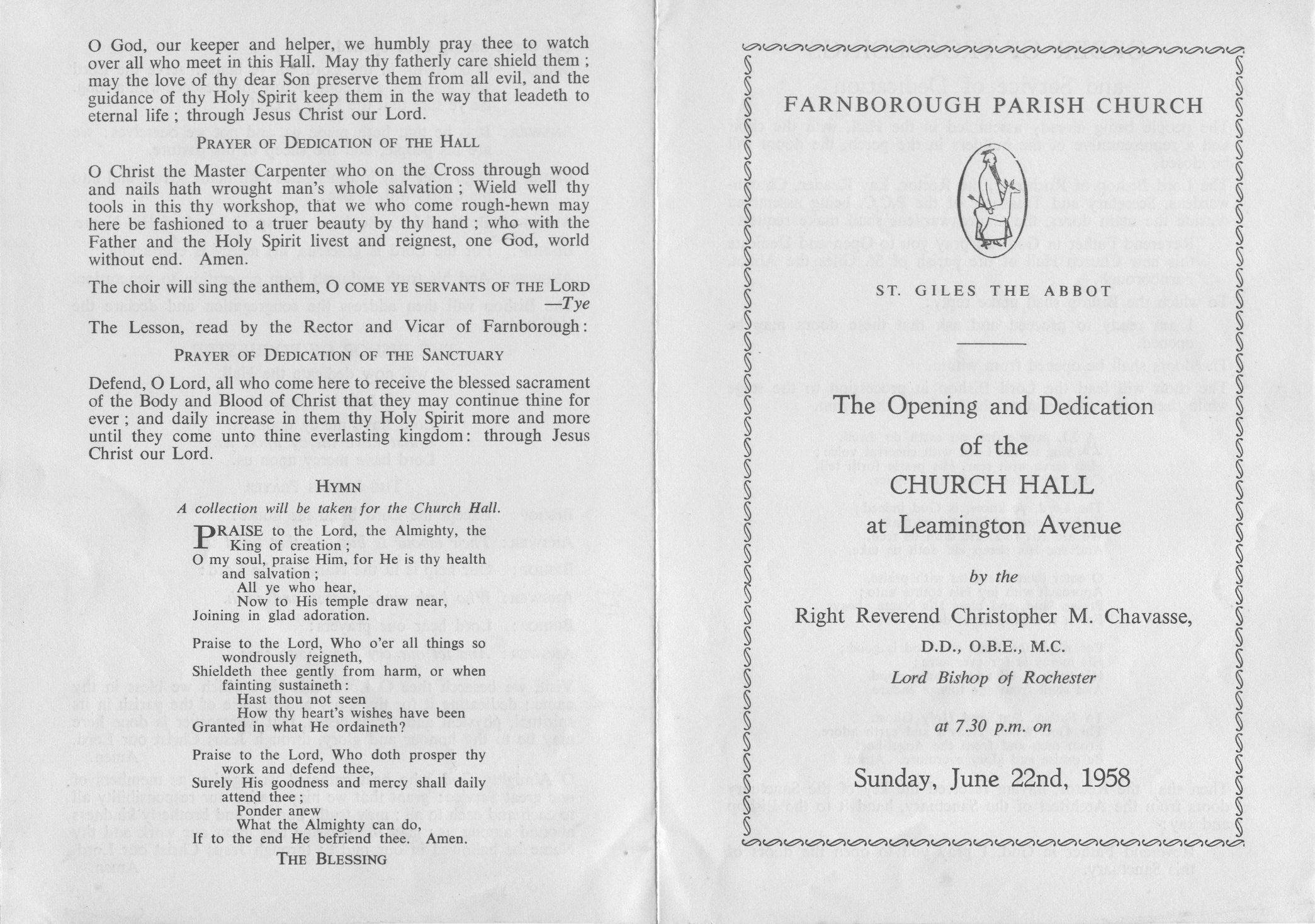 After a shortened form of Evensong in the Church, the Clergy, Choir and Congregation (which included the Chairman of the Orpington Council, Councillor C.H.E.Pratt) processed to the Hall. With the many others, including Mr. Donald Sumner, O.B.E. M.P., who had already assembled, they witnessed the Dedication of the Sanctuary by the Lord Bishop of Rochester, the Right Reverend Christopher M. Chevasse. It would be an impossible task to mention all who had worked towards the erection of the Hall but some, by virtue of their office in the church or by special personal qualifications, were able to render especial service. Among those were, the Rector, the Revd. A.A. Chapman, Rural Dean of Orpington; Bishop Guy Warman; the Churchwardens, Mr. L.J. Newling and Mr. D.K. Fairbairn; the Treasurer and Secretary of the Parochial Church Council, Mr. K. Deals and Mrs. S. Stead; Mr. J.W.W. Sachs (legal matters) and the Secretary of the Appeals Committee and the Church Hall Committee, Mr. P.J. Reeves. To all who helped by labour or by gift, the Rector and the Council offer grateful thanks.